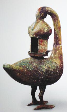造型作鸿雁回首衔鱼站立状。鱼腹为灯罩,雁颈为导烟管,盛有水的雁腹是消烟装置,内部中空且相通。灯盘为两片弧形铜挡板,可左右转动开合,既能挡风,又可调节灯光的亮度。毕竟“一点分明值万金,开时惟怕冷风侵”。灯火点燃时,烟雾通过鱼和雁颈导入雁体内,防止了油烟对室内空气的污染,有效地保持室内空气的清新。它将实用功能、优美的造型与科学的环保原理有机结合在一起,是汉代人的全新发明。鸿雁被认为是传送思念和祝福的吉祥鸟,鱼“余”谐音寓意生活富足有余。鸿雁衔鱼的造型,体现了汉人的美好愿望,遍施华美的彩绘,反映了汉代的审美风尚。