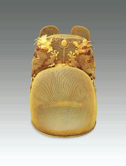 金冠是皇帝的常服冠戴,翼善冠出土时放置在万历帝棺内头部北侧一个圆形木盒内。其形制由前屋、后山和金折角三部分组成,前屋部分是用极细的金丝编成“灯笼空儿”花纹,空当均匀,疏密一致,无接头,无断丝。后山部分是采用纍丝錾金工艺而成的二龙戏珠图案,龙的造型雄猛威严,具有强烈的艺术装饰效果。翼善冠用极其纤细的金丝编结,采用传统的掐丝、纍丝、码丝、焊接等方法,工艺技巧登峰造极,充分反映了明代金细工艺的高超水平。
