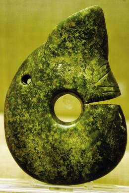 墨绿色玉琢磨而成。猪首双耳竖起,两眼相对圆睁,吻前伸,口微张,鼻间有阴刻皱纹。龙体蜷曲无足,像蛇身,首尾相接处缺而不断,背部对穿一个供系挂的小孔。此物一般用作祈求吉祥和护身符悬挂在胸前,反映了先民对美好生活的向往和对平安的企盼;也是代表某种等级和权力的祭祀礼器。