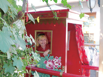 8月15日,在北京什刹海奥运人家,一位洋女士兴致勃勃地坐上花轿,感受中国传统民俗。本报记者 王辉摄