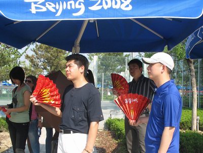 赛场内外,大街小巷,随处可见观看比赛的中外体育迷,手持“助威扇”,一边轻打手心发出巨大的助威声,一边大声呐喊“中国加油,奥运加油”,不时也有多人一起将手中的“助威扇”同时打开,呈现出一片“为中国助威”的巨大展示面,气氛极其热烈,“助威扇”以其精巧的创意得到了众多观众的交口称赞。