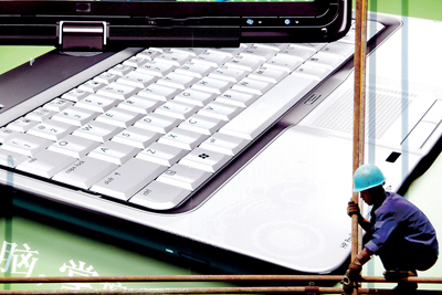 上图:近年来,笔记本电脑市场发展迅猛,厂商之间竞争也愈发激烈,图为工人正在街头安装大型户外笔记本电脑广告。张和平摄
