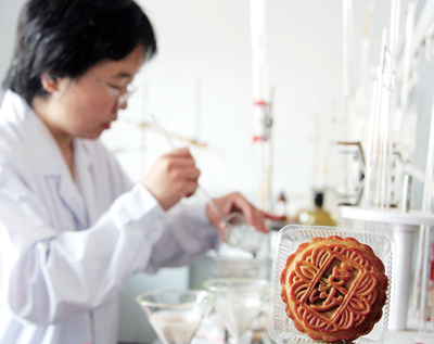 题图为:8月27日,河北省邢台市质检所检验人员对月饼馅料含量进行检验,以确保市民吃上放心月饼。检查范围有月饼馅料、面粉、油、产品使用食品添加剂生产原料和产品包装标识,非法搭售其他商品和委托加工是否符合要求等情况。据介绍,经过检查发现该市的月饼质量状况良好。陈雷摄