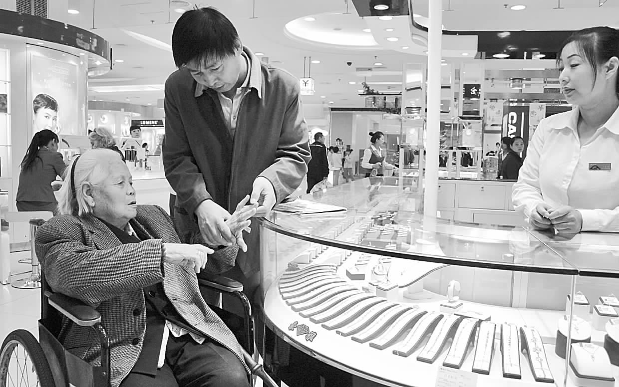10月7日,重阳节。50岁的胡先生推着轮椅车,带着86岁的母亲郭老太太,来到北京东安市场,为老人家选购戒指,情景感人。