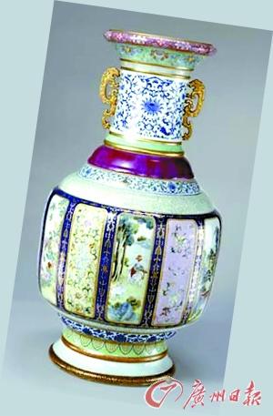 鉴定:从图片看,这是一件现在新仿的作品,底款为“大清乾隆年制”,真品在故宫博物院有一件,称为“各种釉彩大瓶”。现在,仿制的新工艺品,因其全身综合了各种釉彩工艺而被称为“瓷王”,“中华瓷王”瓶等。此瓶敞口,束颈,颈下渐广,瓜楞腹,圈足外撇。颈部两侧为贴金彩夔形耳。全瓶从上到下共分16段釉彩,各种彩釉间以金彩圈线相隔。口部饰金彩、紫地粉彩、绿地粉彩各一周。颈部饰仿哥釉、青花、松石绿釉各一周。肩部饰窑变釉、斗彩。腹上部饰粉青。腹部饰12个霁蓝地描金开光,内中彩绘吉祥图,其中6幅为花卉、蝙蝠、蟠螭、如意、万字带等组成的寓意“福寿万代”的图案,另外6幅为“三阳开泰”、“丹凤朝阳”、“太平有象”、“吉庆有余”以及楼阁山水、博古图等。腹下及足部依次饰哥釉、青花、绿地粉彩、红地描金、仿官釉、霁蓝釉描金等。瓶身纹饰亦繁复多样,有缠枝花卉、缠枝莲纹、团花、焦叶纹、回纹、勾菊纹等。作为新工艺品,数量非常多,具有一定的观赏价值。