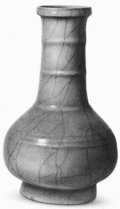 官窑粉清釉弦纹长颈瓶 南宋 高33.6厘米,口径9.9厘米,足径14厘米。