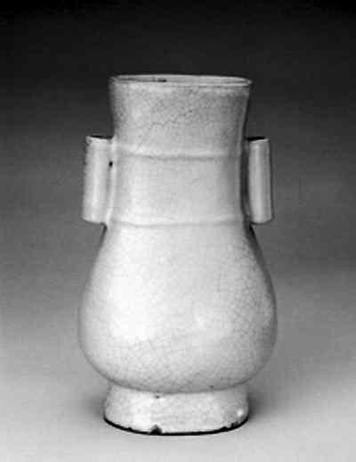 官窑贯耳扁瓶 北宋 高23厘米,口径9.4厘米,足径6.3厘米。