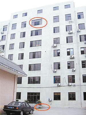 ▲谢贵华生前照片上圆圈处为死者跳楼窗口,下圆圈处为坠楼处。