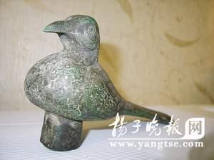 说起这个杖首的来历,杨立昌说这要追溯到10年前。那时候,夫子庙的东、西二市,是他经常去“练眼”的地方。在一家经常光顾的古玩店里,这只浑身满是铜绿的杖首忽然跃入了他的眼帘。“这是什么?”杨立昌明知故问。“我也不太清楚,应该是哪个大件上的配器吧。”老板倒也诚实。最后,杨立昌以很低的价格把这件保存完整的鸠鸟杖首“拿下”了。