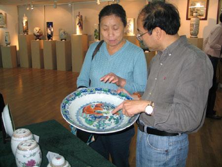 陶瓷爱好者正在品鉴一件青花斗彩大盘
