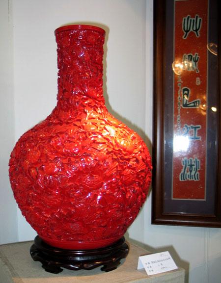 方荣作品 辣椒红雕刻牡丹天球瓶