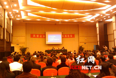 红网长沙11月18日讯(记者 李慧芳)“不是冬眠,而应是冬补!”“不能等待,危机中有危险也就有机会!”……11月18日,在湖南省工商联组织的民营企业家科学发展观报告会上,以叶文智、邱则友、罗可大等为首一批湖南民营企业家们围绕着科学发展观展开了激烈演讲,湖南各民营企业家们面对全球经济危机表现出的乐观和积极应对情绪让人顿感这个“冬天”不太冷!