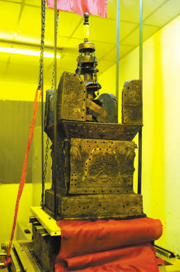 据悉,由于塔刹的山花蕉叶四个边紧紧卡住了铁函四角,加上塔身外面还包裹了丝织物,因此阿育王塔完全被“锁”住。经过3个月的努力,考古专家终于用“蒸锅提碗”法解决了铁函开启难题。