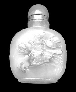 三是玉质鼻烟壶。这种鼻烟壶的优劣,主要取决于玉质的优劣和做工精细与否。清代的玉质烟壶大多是素器,有花纹的较少。今天见到的玉质烟壶多是清乾隆年间的,式样精巧,质感温润。