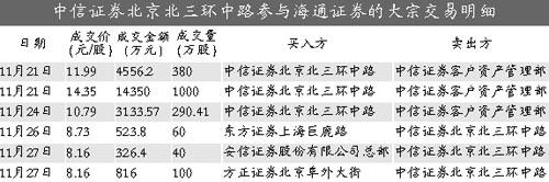 根据上交所信息,中信证券北京北三环中路营业部前几天曾在大宗交易市场上积极接盘海通证券:11月21日,以14.35元(高于当天收盘价19.48%)和11.99元(高于当天收盘价1分钱)分别买入1000万股和380万股;11月24日以10.79元(高于当天收盘价1分钱)买入290.41万股,卖出方均为中信证券客户资产管理部。