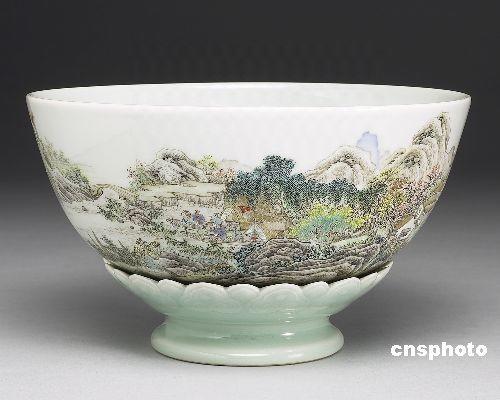 图为展出的“磁胎洋彩山水詩意转旋大碗”。