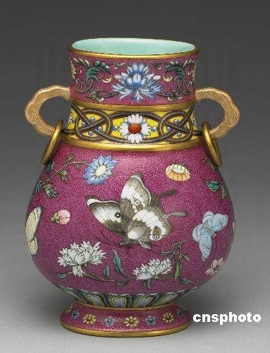 造型源自商周青铜壶的“磁胎洋彩锦上添花喜相逢双环腰圆瓶”,制作精巧,瓶上活环是在坯体烧制时以细小支钉,将活环与耳支撑,烧成后再将支钉移除,复施金彩覆盖,再次以低温烧成时,支钉眼已不易发现。瓶体所绘成对蝴蝶相遇称之“喜相逢”,喻意吉祥。