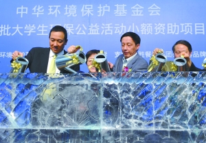 由中华环境保护基金会发起、必胜客餐厅赞助的第三批大学生环保工艺活动小额资助项目昨天启动。来自全国高校学生社团的50个公益项目得到资助,每个项目资3000-10000元不等。左一为必胜客母公司百胜餐饮集团中国事业部总裁苏敬轼。本报记者 李强 李静 摄影报道