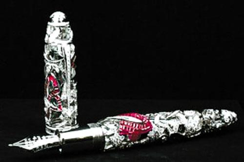 笔坛至尊万宝龙(Montblanc)与珠宝翘楚梵克雅宝(Van Cleef &Arpels)同庆百年盛典,将双方享誉盛名的制笔及珠宝镶嵌工艺融合一体,创制出史无前例的华贵名笔典范:神秘巨匠限量系列。神秘巨匠系列备有红宝石、蓝宝石及祖母绿三款设计,各限量生产三支;而镶嵌红宝石的款式已于2006年12月率先亮相。钢笔由白金铸成,镶有红宝石、蓝宝石、翡翠、钻石,其中钻石数量达到840颗,宝石总重达到20克拉。梵克雅宝的隐密式镶嵌法将镶爪完全隐藏,让宝石及美钻的光彩恣意绽放。万宝龙的制笔造诣可说旗鼓相当,镀了白金笔嘴的刻工精妙细致。而高达73万美元(约合人民币548万元)的售价,更凸显神秘巨匠系列的超凡身价。