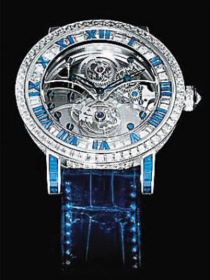 瑞士昆仑表给这款限量版手表取名叫“经典亿万陀飞轮”,850颗钻石覆盖着表壳、表耳、表把,44颗长方形蓝宝石让表圈灿烂夺目,罗马数字上显著的宝石,提升了