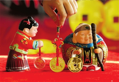 昨天,中钞国鼎公司即将发售的“压岁金钱”亮相。该产品采用.999纯金铸造,形状类似古铜钱,分“寸草春晖”和“金玉满堂”两种,有3克、10克、20克和50克四种规格。12月27日,该产品将在中钞国鼎北京城乡贸易中心店上市。本报记者 胡雪柏 摄影报道