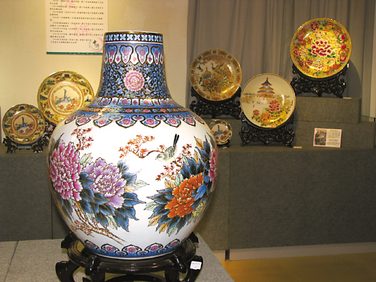 这次参展的作品就有知名的《堆金花鸟天球瓶》(见左图),还有潮州唯一的国家陶瓷艺术大师吴为明的拿手好戏“色釉碟”,其采用高温色秞作为颜料,通过烧制成一幅别开生面的山水画。展览在广州荔湾区周门北路40号首层彩虹会,2009年1月5日结束。