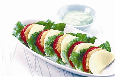 蔬果乳酪,把新鲜的柳橙和酸甜的西红柿切成薄片,像夹三明治那样,把起司和生菜包起来,吃一口,嘴里有种很清爽的感觉。