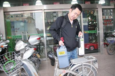 在北京某家电动自行车商场,苏州星恒电源有限公司的工作人员展示了锂电池和传统的铅酸电池。锂电池具有更轻、更高效、更环保的诸多优势,但是铅酸电池以其较低的使用成本,仍然占据了绝大多数的市场份额。本报记者罗 兵摄