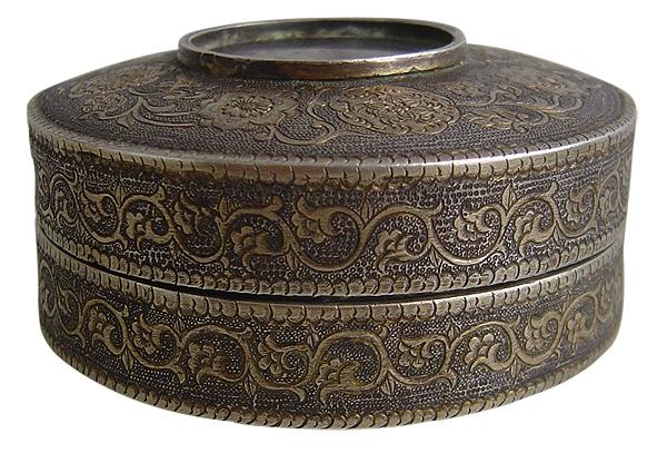 笔者收藏的这件唐代银鎏金神兽宝相花纹银盒,比例协调,造形端庄大方,工艺精湛(锤叠,錾刻,焊接,鎏金,抛光),是盛唐时期金银器皿的代表作之一。直径8厘米,高3,8厘米,圆形,盒盖底皆为隆面,矮圈足,可开启闭合,为唐代妇女盛放化妆品用物。全器以鱼子纹为地,共分五个装饰区间,盖面中心圆内錾刻一只脚踏祥云的威猛飞翼神兽,中心圆圈内外线为圆珠纹,中间为菱形几何图案,圆圈外为连曲宝相花组成第二区间图案。盖面口沿錾刻细小的变形仰莲纹。盒身主体纹饰为錾刻唐草纹,底面文饰相同于盖面纹饰,皆由连曲宝相花组成,盖面和器身转折处及圈足,都采用焊接工艺。全器纹饰皆鎏金,因使用年代久远大部分脱落。