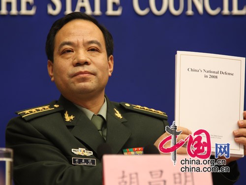 2009年1月20日10时,新闻办举行新闻发布会,请国防部新闻发言人、国防部新闻事务局局长胡昌明大校,总参作战部战略规训局副局长蔡怀烈上校,总政群工办副主任石楚敬大校,总后司令部战勤计划局副局长薛勇康大校,总装综合计划部综合局副局长范建军大校介绍2008年中国的国防白皮书,并回答记者提问。图为国防部新闻发言人、国防部新闻事务局局长胡昌明大校。