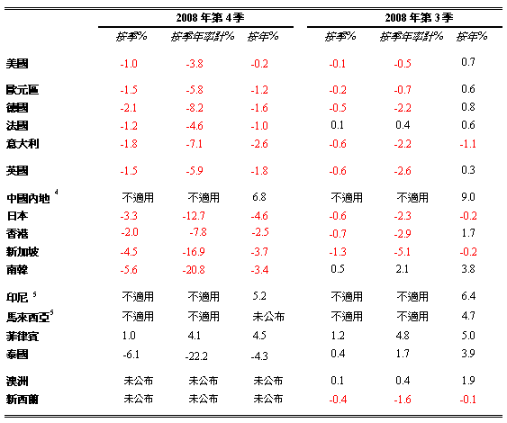 附表列载环球及区内各主要经济体系的最新GDP统计数字,显示现时全球经济逆转的严重程度。显然这场危机是多年来最恶劣的,香港当然不能独善其身。内地经济持续录得正增长,无疑对香港会起到一定的缓冲作用,但香港的外向型经济很受世界各地所面对的问题影响,我希望提醒大家作好准备,面对逆境。