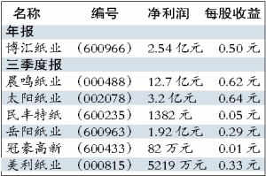 一家公司是否分红首先与公司的当期业绩相关,每股收益数据决定了公司的分红前景。目前来看,大多数造纸公司的净利润都在增长之中,每股收益达到了一定数额。其中,除开年报净利润增长的博汇纸业外,行业领头羊晨鸣纸业的去年三季度净利润超过了12.7亿元,同比增长85%,每股收益达到了0.62元;美利纸业的去年三季度净利润大幅度上升了64%,达到了5219万元,每股收益0.33元;岳阳纸业的净利润暴增了184%,达到了1.92亿元,每股收益为0.29元;民丰特纸每股收益为0.05元,净利润增长27%,为1382元。