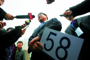 昨日,三元“联合竞拍体”在石家庄中级人民法院对三鹿破产首批资产的竞拍中,以6.165亿元的价格竞拍成功。该部分资产包括土地使用权、房屋建筑物等可持续经营的有效资产和三鹿所持有的新乡市林鹤乳业98.8%的投资权益。图为竞拍者北京三元集团党委副书记范学珊手持58号牌接受记者采访。 任涵 摄详见B03