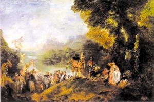 华托的代表作《发舟西苔岛》画于1717年,在华托所处的时代,西苔岛是艺术界一个极为流行的主题。画面上金色的霞光普照大地,一群贵族情侣在等待依次登上缀满鲜花的彩船,成群的小天使在恋人们头上盘旋飞翔,交织出梦幻与现实相融的情景。整幅画面洋溢着无限缠绵之情,贵族男女梦寐以求地幻想有一个无忧无虑的爱情乐园,写实的前景和人物与抽象的飘渺远景构成一幅世外桃园的梦幻景观。他们与其说是在向西苔岛这一传说中的恋人之岛进发,还不说是正依依不舍地离开它。画面构成了一个流动的时间曲线,形成活动的人物与安谧寂静的风景之间的对比。画面在表达一种看起来轻松愉快的主题时,也隐约流露出一股忧伤的情调。这幅作品一举轰动了当年的巴黎沙龙。