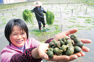 4月7日,江西省玉山县田螺养殖场的工人正在用黑麦青草饲养田螺。据养殖场工人介绍,用人工种植的黑麦青草来饲养田螺,不仅节约了成本,美化了环境,还提升了田螺肉产品的质量。目前,这里的田螺产品已远销韩国、日本市场。