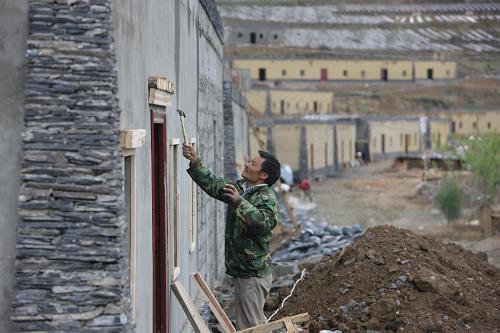 4月18日,工人在汶川萝卜寨修建房屋。萝卜寨距离汶川县城18公里,集羌族文化与自然风光于一身,被称为“云端里的街市”。汶川地震使萝卜寨遭到严重损坏,全貌基本被毁。目前,在援建单位和当地政府的共同努力下,当地群众正在积极进行灾后重建,村民争取在6月30日前全部入住新居。新华社记者 邢广利 摄
