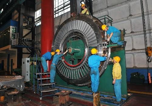 4月17日,东方汽轮机厂的工人们在燃汽轮机的透平叶环旁工作。 位于四川省德阳市汉旺镇的东方汽轮机厂,是国家研究、设计、制造大型电站汽轮机的大型骨干企业,是世界上制造能力最强的汽轮机制造企业之一。2008年5月12日,突如其来的特大地震,瞬间摧毁了东汽大片厂房和大量设备,几百人遇难,上千人受伤。然而,东汽人没有被地震震垮,他们以特有的坚忍和毅力,从余震不断的废墟上跃起。他们掩埋好遇难同伴和亲人的遗体,擦干泪水,抗震救灾,恢复生产。目前,东方汽轮机厂已全面完成了2008年灾后制定的各项生产经营任务,完成产品产量2320万千瓦、实现工业总产值108亿元、销售收入89亿元,新增订货239亿元,以辉煌的业绩书写了中国工人阶级“泰山压顶不弯腰”的伟大篇章。 新华社记者 何俊昌 摄