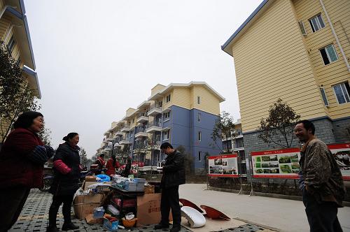 这是在四川省都江堰市向峨乡石碑新村,几位村民在村口经营小商品(2月25日摄)。据统计,截至2月25日,四川灾区开工新建城镇永久性住房8.58万套,占总数的27.37%,其中已建成1.67万套,占5.32%;永久性农房开工114.3万户,占需要重建的90.5%,其中建成68.8万户,在建45.5万户。新华社记者 江宏景 摄