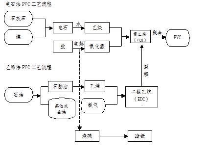 PVC的生产主要有两种制备工艺,一是电石法,主要生产原料是电石、煤炭和原盐;二是乙烯法,主要原料是石油。国际市场上PVC的生产主要以乙烯法为主,而国内受富煤、贫油、少气的资源禀赋限制,则主要以电石法为主,截至到2007年12月,电石法约占我国PVC总产能的70%以上。