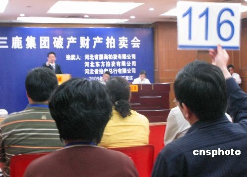 5月8日,河北省石家庄市中级法院继续公开拍卖石家庄三鹿集团破产财产。唐山恒天然三鹿牧场有限公司15%的股权、唐山市康圣乳业有限公司70%的股权、河南花花牛乳业有限公司25%的股权均被拍出,保定三鹿乳业有限公司51%的股权因故撤拍,择日再拍。图为116号竞买人分别以1600万人民币拍得唐山恒天然三鹿牧场有限公司15%的股权、以4150万人民币拍得唐山市康圣乳业有限公司70%的股权。中新社发 翟羽佳 摄
