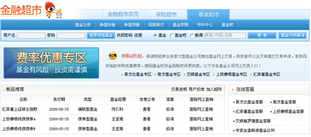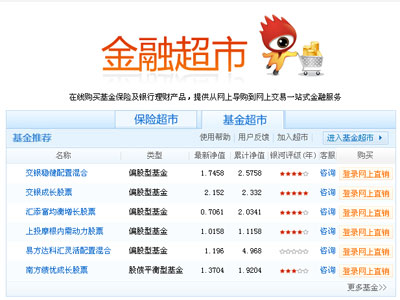 从“新浪金融超市”点击 “基金超市”或“更多基金”,将进入“新浪基金超市”,这个页面提供所有在新浪网可以直接进行交易的基金。