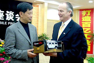 3月11日,悍马公司首席执行官詹姆斯·泰勒(右)在四川德阳向当地官员赠送车模。新华社 黄建培 图