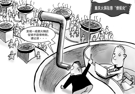 重庆火锅在蓉设“情报处”,成都的消费者举双手赞成,“有竞争才有进步,成都火锅和重庆火锅竞争,必然会让味道、服务都提高,价格也合理,最终受益的是我们消费者。”爱吃火锅的市民严小姐对记者说。成都火锅界对此消息反应很冷静。成都老码头火锅负责人表示,不管重庆火锅如何折腾,只要成都火锅练好内