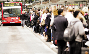 10日,大批伦敦市民在一处公交车站等待上车。英国铁路、海运及运输工会因与伦敦运输局资薪谈判破裂,于9日晚7时开始48小时罢工。罢工导致伦敦地铁的11条线路中有5条完全停运,仅有1条仍在正常运行,该市公共交通体系几近瘫痪。此外,罢工直接导致经济损失达1亿英镑。