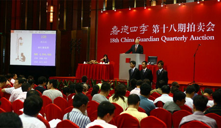 2009年6月28日,第十八期嘉德四季拍卖会在北京国际饭店圆满落槌。作为中国嘉德2009年上半年的收官之作,吸引了来自全国各地的众多藏家,全程场面都相当火爆,人气买气齐聚,众多藏家对嘉德四季表现出的热情,再次彰显了嘉德四季独特而持续的品牌魅力。最终,整场拍卖总成交额近1亿4千万元人民币,多场次成交率创出高位。其中,中国书画部分总成交额达9579万元人民币,平均成交率高达到84%,齐白石作品100%成交,海外回流趣作《油灯猫鼠图》拍出448万,创出2009年上半年齐白石作品成交价的新高;首次推出的四川画家专题成交率也达百分之百,并且众多作品成交价在估价的十余倍左右。瓷器工艺品部分总成交额达4100余万元人民币,创出嘉德四季瓷器工艺品部分成交新高,平均成交率也高达83%。