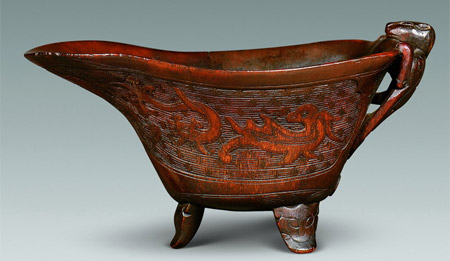 其中,一件“明犀角雕螭龙纹爵杯”雕琢成龙首形,雕工精细,须緑根根可见,杯体侧面镂雕一螭虎匐于杯口,颇为生动传神,为整器增添几许生气,并可兼作手柄之用。此杯器形、纹饰均仿自上古青铜器,雕工古朴雄健,别具一格,受到众多藏家青睐,最终以44.8万元人民币成交。另一件“犀角雕五子弥勒像”为整根犀角圆雕而成,材质硕大,角质温润,弥勒双耳垂肩,喜笑颜开,雕琢细致,题材喜人,最终拍出49.28万元人民币。