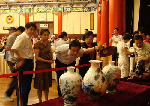 在全国政协礼堂热烈而隆重的现场气氛中,由景德镇市文化局长江华进行收藏交接仪式,将《锦绣中华》瓷赠予"中国名家收藏专业委员会"永久珍藏,赢得全场掌声不绝于耳。江华表示:60年来,随着景德镇社会和经济的发展,老一辈陶瓷美术家,以及新一代中国工艺美术大师他们聚集一堂,互相交流,博采众长,他们领导着中国陶瓷的潮流,立志为世人创造出至美至纯、寓义深刻的、风格各异的陶瓷艺术珍品,《锦绣中华》特制珍藏瓷就是当今景德镇众多优秀作品中非常突出的一个。通过它可以了解景德镇制瓷的历史,中国60年来的辉煌成就。可以说,这套《锦绣中华》特制珍藏瓷,无疑是景德镇献给祖国60年华诞的最好礼物。