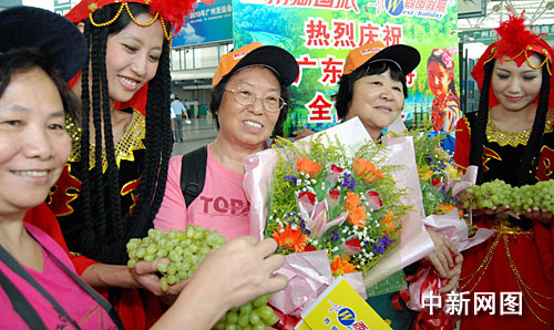 中新网广州7月31日电 (莫非林月明)在广州白云机场出发厅,身着漂亮维族服饰的姑娘热情地将缤纷美丽的鲜花送给游客,盛情邀约广东游客赴美丽的新疆旅游。这是自“7·5”事件后,广东首批赴新疆旅游的游客上航班前经历的一幕,意味着暂时停滞了近一个月的广东新疆游市场,终于全面恢复正常。