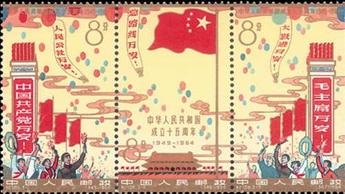 1964年10月1日,首都各界人民在天安门广场隆重举行庆祝中华人民共和国成立15周年典礼。来自世界80多个国家和地区的国家元首和贵宾三千多人参加了典礼。典礼后举行了盛大的群众游行。为庆祝建国15年来我国在各方面所取得的辉煌胜利邮电部发行了这套纪念邮票,编号纪106,全套3枚横联印,分别为“中国共产党万岁”、“庆祝中华人民共和国成立十五周年”、“毛主席万岁”。
