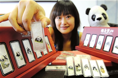 以“国宝迎国庆”为主题的贵金属纪念品“《国庆熊猫》彩色银条纪念摆件”昨天在北京正式亮相。同时,编号为2009的产品将赠送北京市动物园做永久性珍藏。这也是在金银纪念币之外,彩色熊猫第一次登上贵金属纪念品。 本报记者 胡雪柏 摄影报道